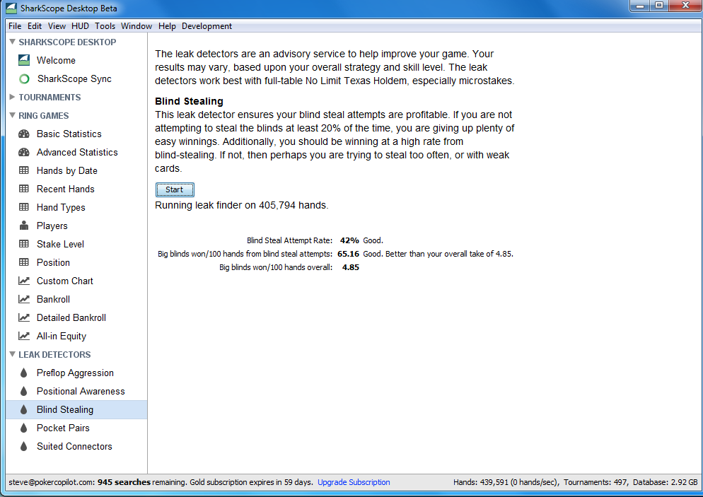 This leak detector ensures your blind stealing attempts are profitable. You should be trying to steal the blinds at least 20% of the time; otherwise, you are giving up plenty of easy money. In addition, you should be winning at a high rate from blind-stealing. If not, then you may be trying to steal too often, or you are trying to seal with weak hands.