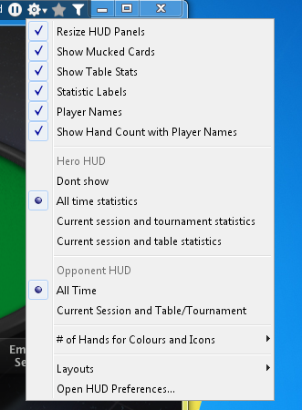 When you are playing at the poker table you can configure the HUD without having to switch to the preferences. Click on the cog wheel in the table’s HUD panel. Many HUD options can be set directly from this menu.