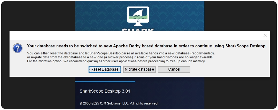Migrate Database: This is for specific users who no longer have hand history files present and source H2 database is the only source of hands. This requires extra RAM, hard disk space and time, so be sure to perform this step when not playing or using your SharkScope Desktop.