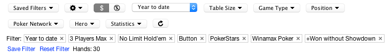 There is no limit to how many filters you use at once. All of them will be applied, letting you analyze very precise situations. For example, here I’m viewing all No Limit Hold’em hands I played this year on Winamax or PokerStars, on 3-max tables, where I won without showdown, while on the button: