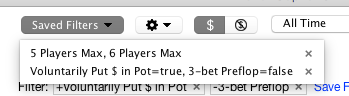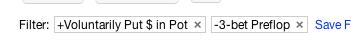 Notice how this filters are shown in the lower part of the filter bar. A small plus sign in front of “Voluntarily Put $ in Pot” indicates that this is true. A small minus sign in front of “3-bet Preflop” indicates that this is false.