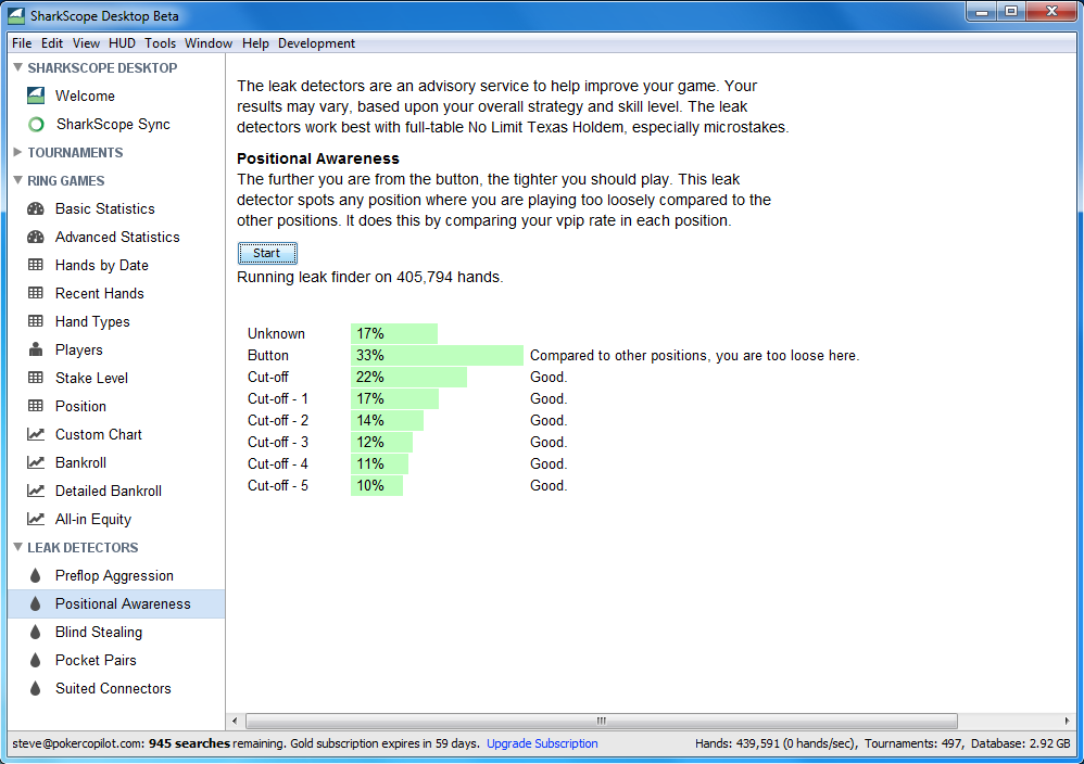 As a general rule, the further you are from the button, the tighter you should play. This leak detector compares your VPiP rate for each position, and lets you know if you are playing too loosely compared to the other positions.